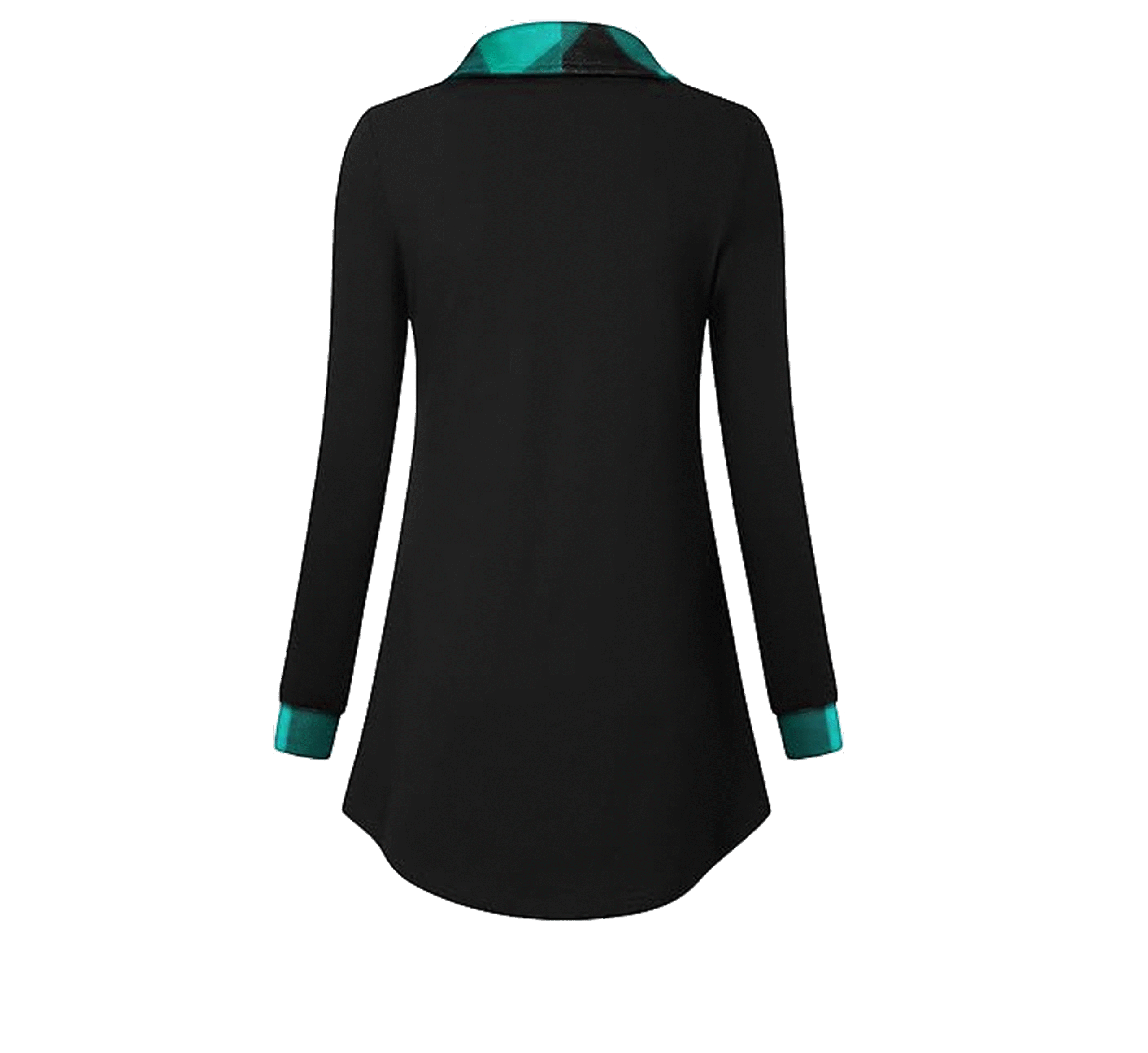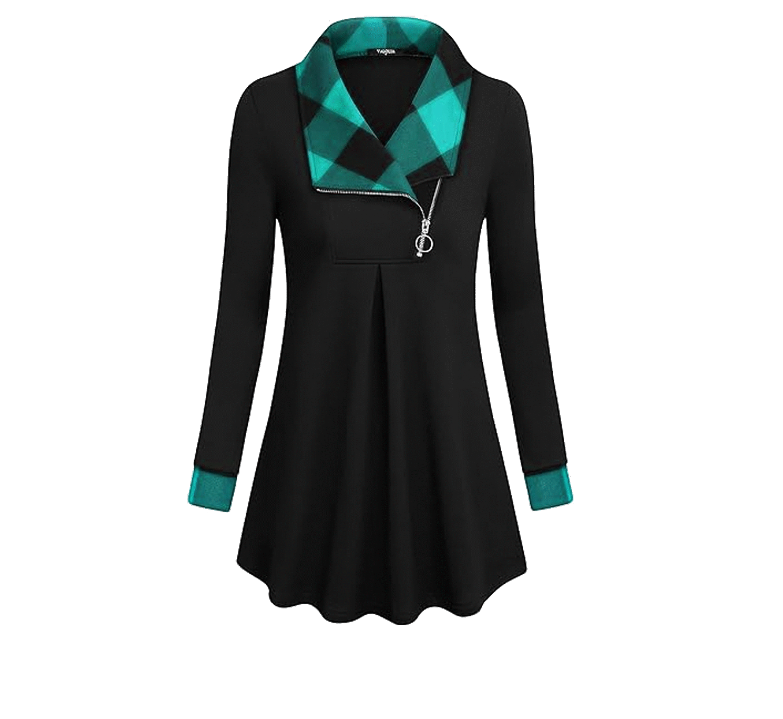 • Long sleeve loose fit curved hem A-line pleated front for slimming look